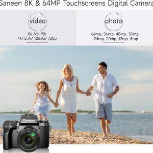 Saneen Digital Camera, 8k Cameras for Photography, 64MP WiFi Touch Screen Vlogging Camera with Flash, 32GB SD Card, Lens Hood,3000mAH Battery, Front and Rear Cameras,Hot Shoe Interface Beginner